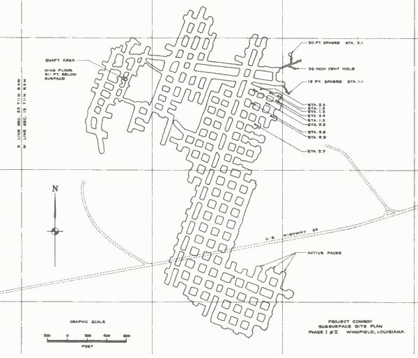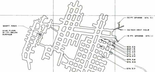 The Carry Salt Works in a unused portion of the mine. Project Plowboy was a 1960, post-shot investigation of fractures in a salt structure from two high explosive detonations during Project Cowboy.